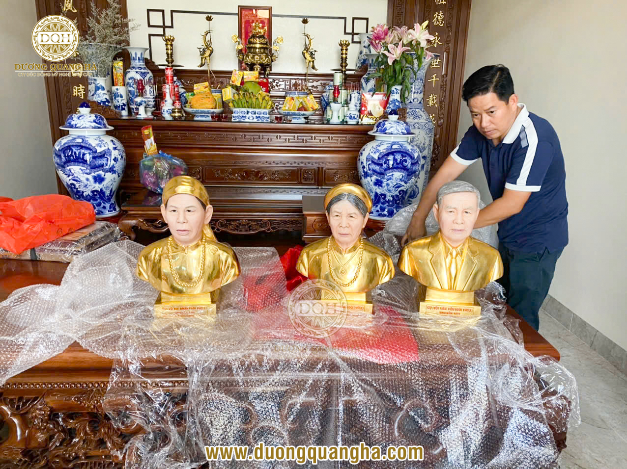 Hoan hỉ ngày lành, đội ngũ Đúc đồng Dương Quang Hà đã hoàn thiện và bàn giao 3 pho tượng truyền thần dát vàng cao cấp (2 pho cụ ông, 1 pho cụ bà) cho gia đình quý khách hàng tại Hải Phòng (Hải Dương cũ).