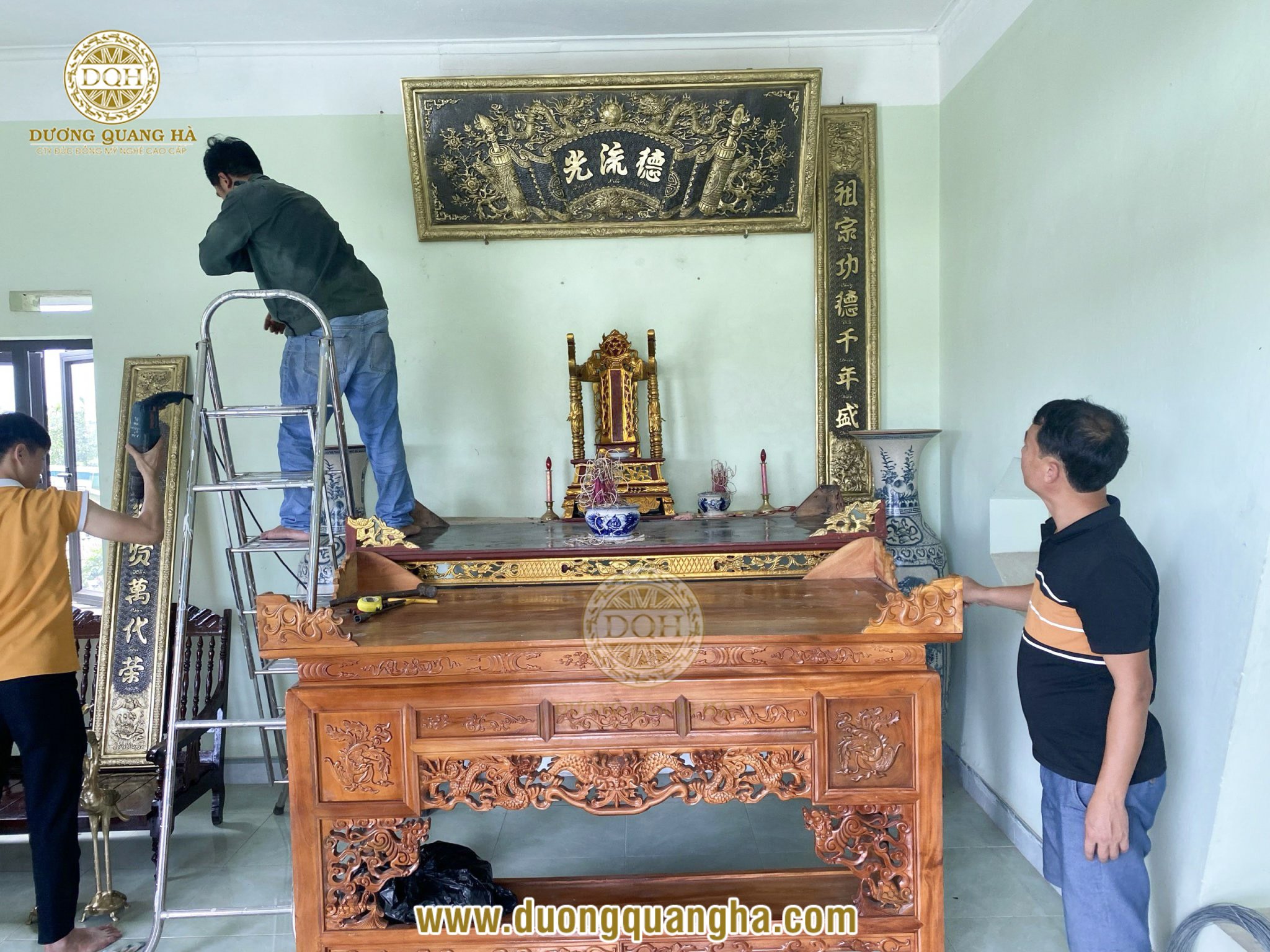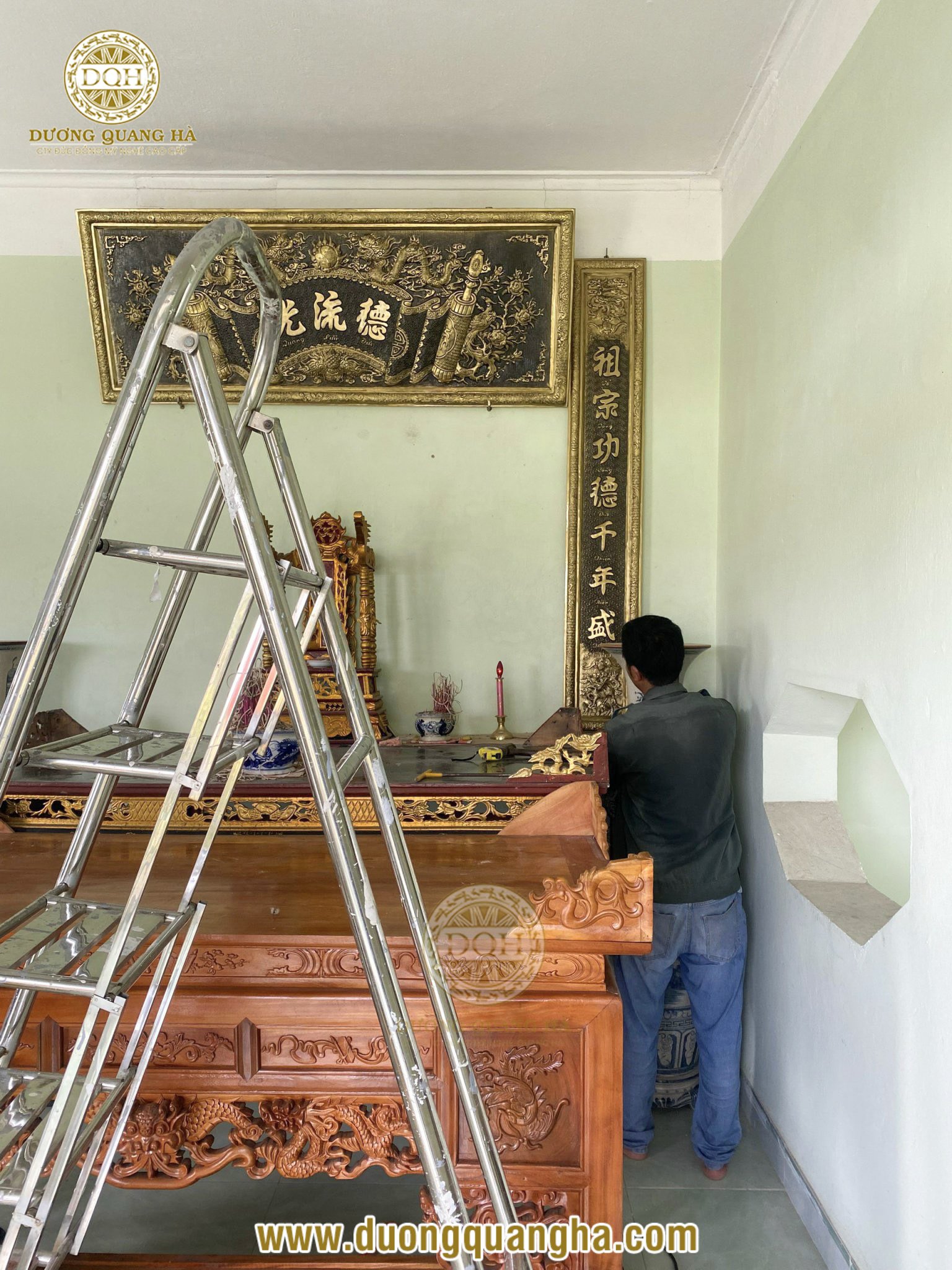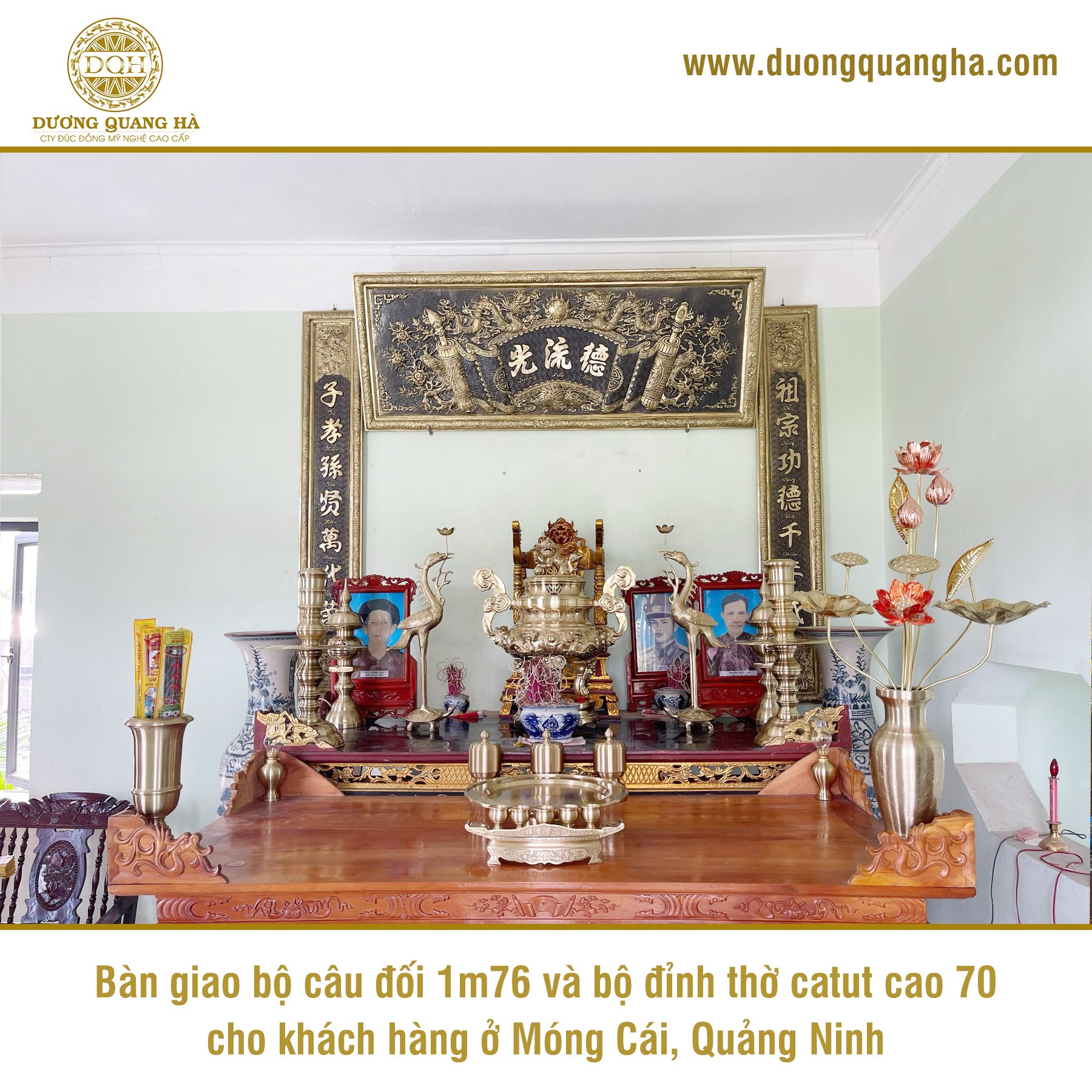 Vượt qua hơn 300km, đội ngũ Đúc đồng Dương Quang Hà đã có mặt tại Móng Cái, Quảng Ninh để bàn giao, lắp đặt bộ câu đối 1m76 và bộ đỉnh thờ catut cao 70 kèm phụ kiện cho khách hàng của chúng tôi.