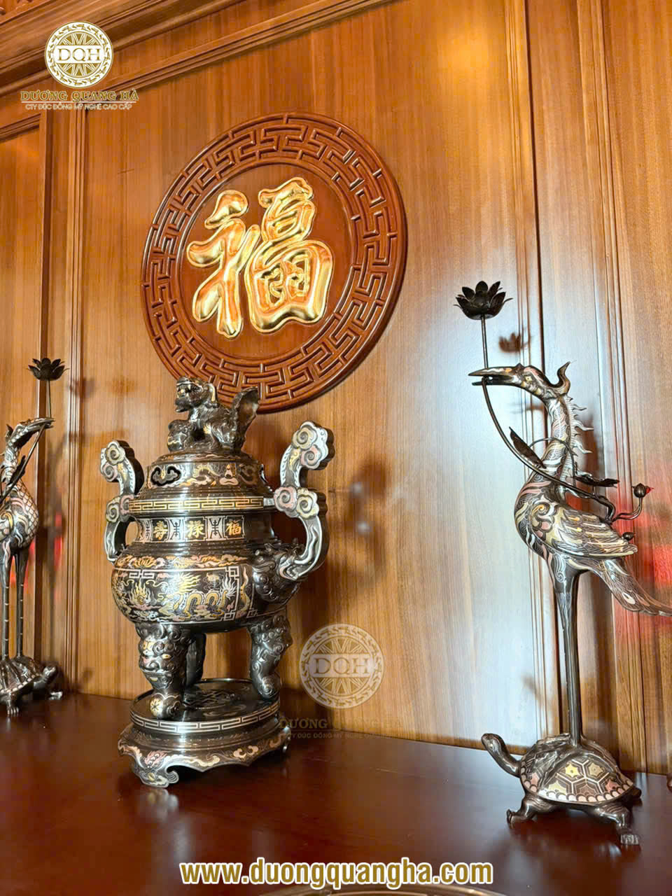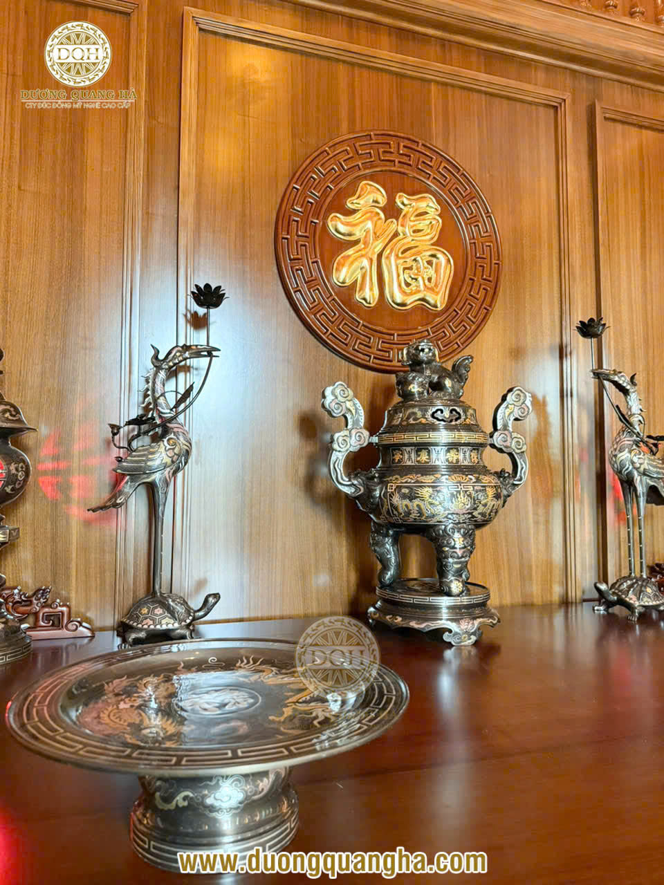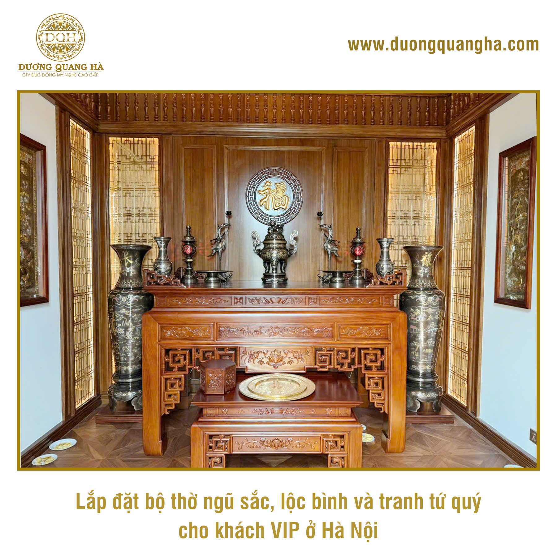 Mới đây, Đúc đồng Dương Quang Hà vừa bàn giao và lắp đặt thành công bộ đồ thờ khảm ngũ sắc, cặp lộc bình cao cấp và bức tranh tứ quý cho không gian thờ tại gia của khách hàng VIP ở Hà Nội.