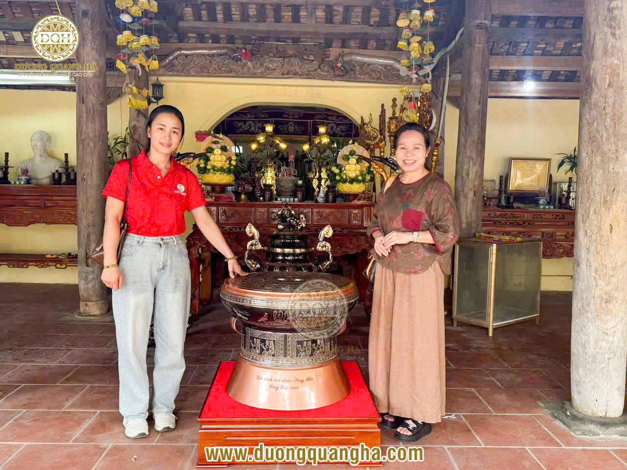 Sau hơn 1 giờ di chuyển, đội ngũ Đúc đồng Dương Quang Hà đã có mặt tại đình Phi Bình (Thanh Hóa) để tiến hành bàn giao trọn bộ: 1 đỉnh đồng, 1 trống đồng và 2 hạc đồng.