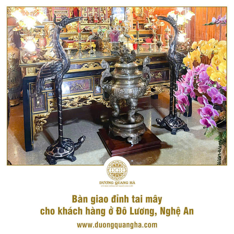 Trên hành trình đưa các sản phẩm đồ đồng chất lượng cao đến với khách hàng miền Trung, Đúc đồng Dương Quang Hà rất vinh dự khi được đồng hành cùng gia đình quý khách hàng tại Đô Lương, Nghệ An trong buổi bàn giao mẫu đỉnh tai mây cao 1m17 - một trong những sản phẩm được ưa chuộng bởi vẻ đẹp tinh xảo và giá trị phong thủy sâu sắc.