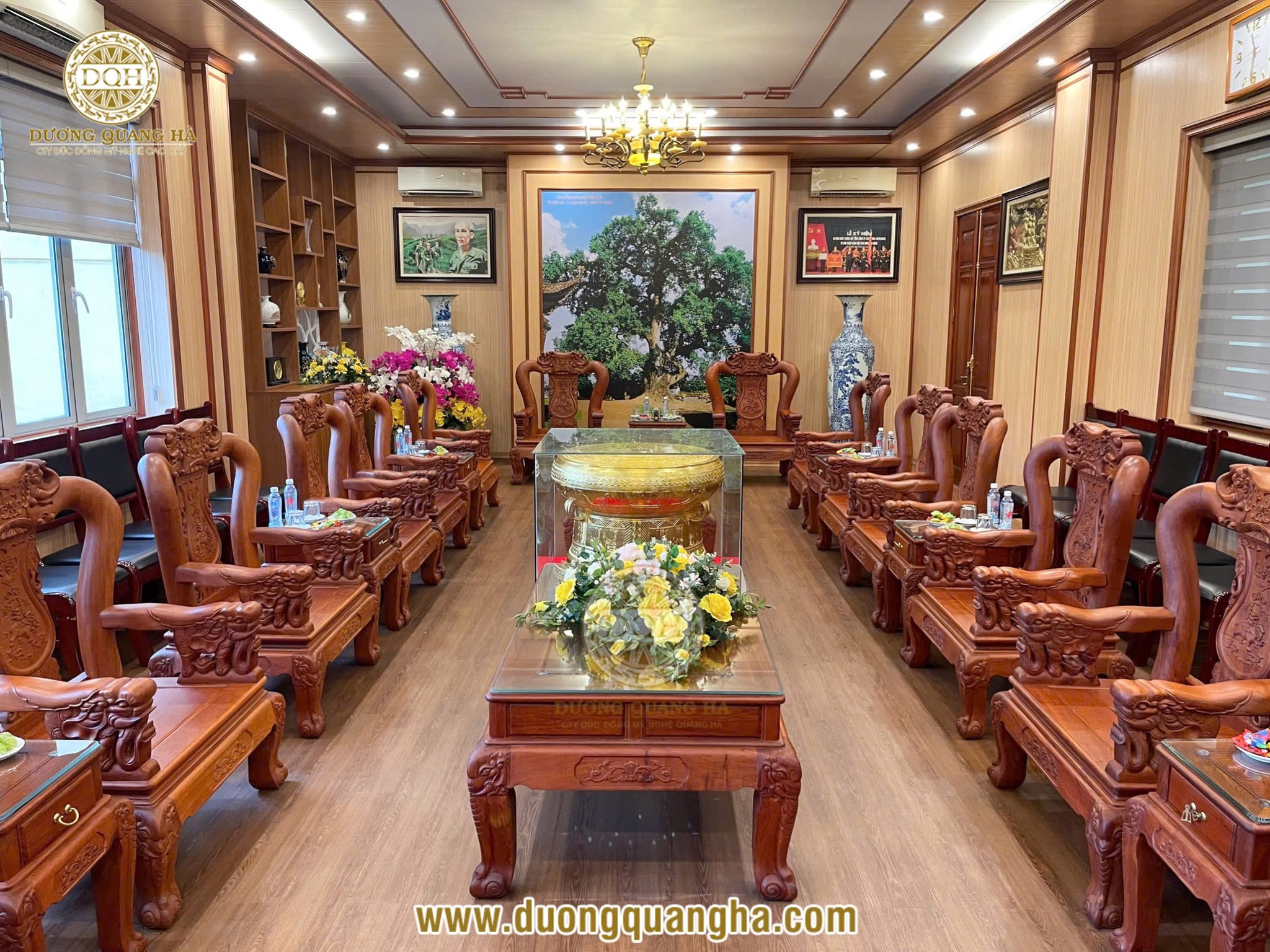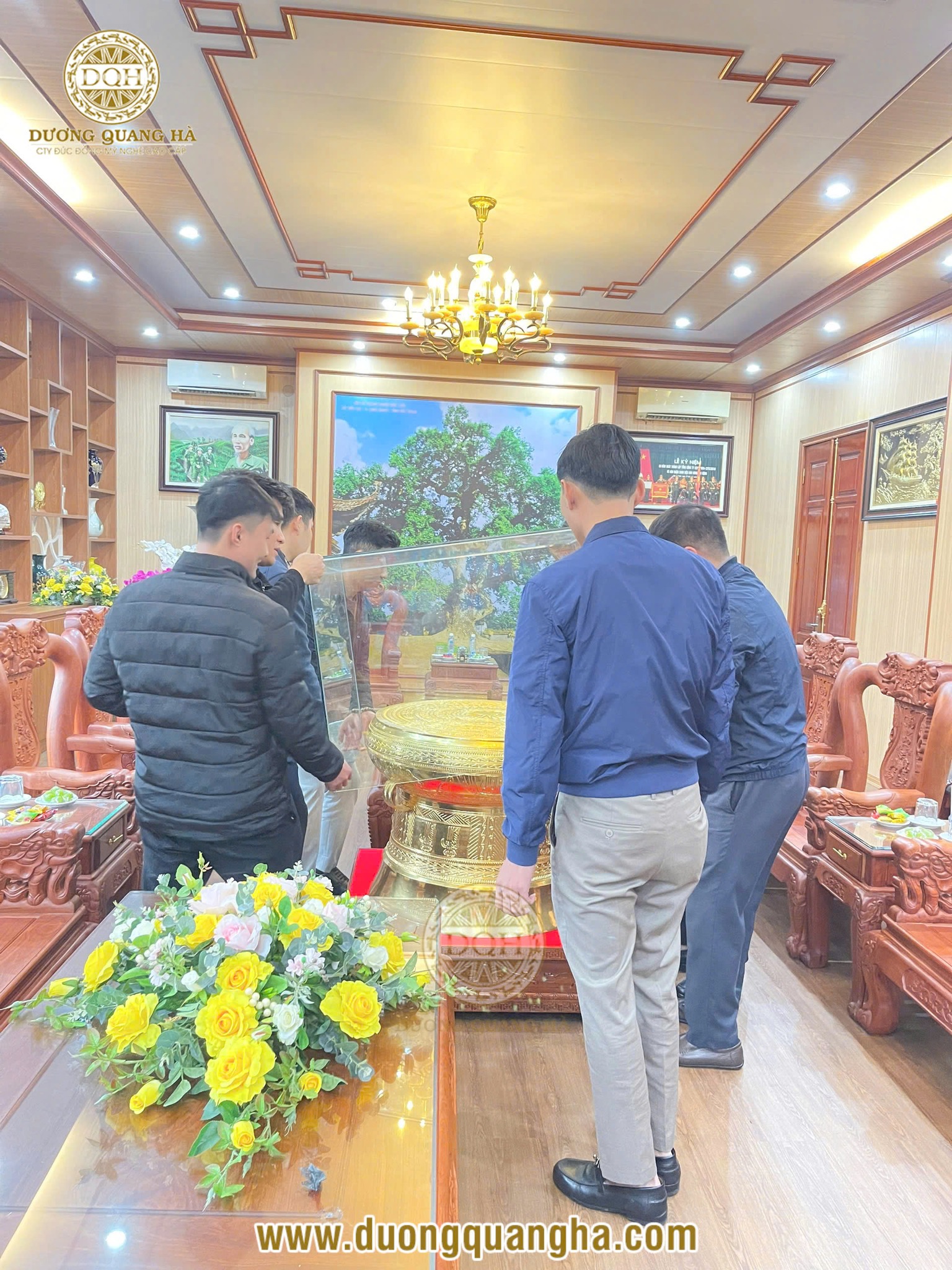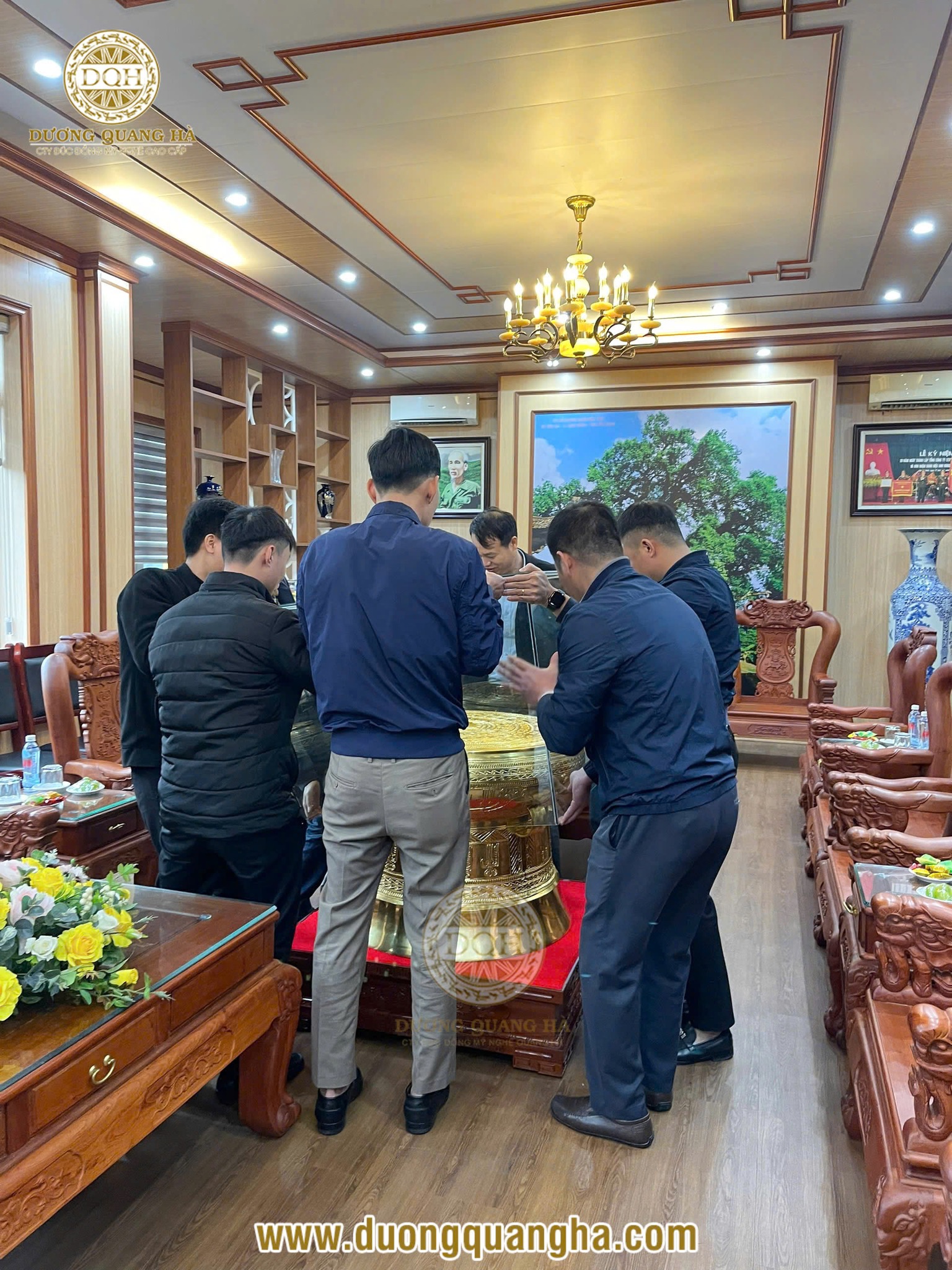Hơn 4 tiếng di chuyển, Đúc đồng Dương Quang Hà đã có mặt tại cơ quan của khách hàng ở Bắc Giang để bàn giao quả trống đồng đường kính 80cm dát vàng theo yêu cầu.