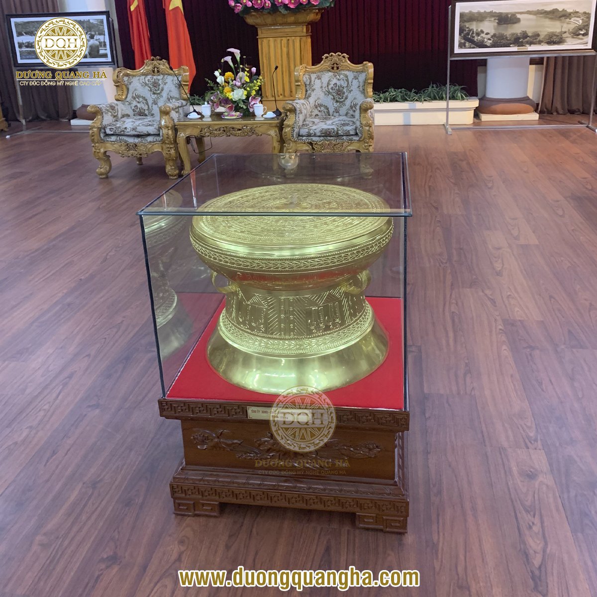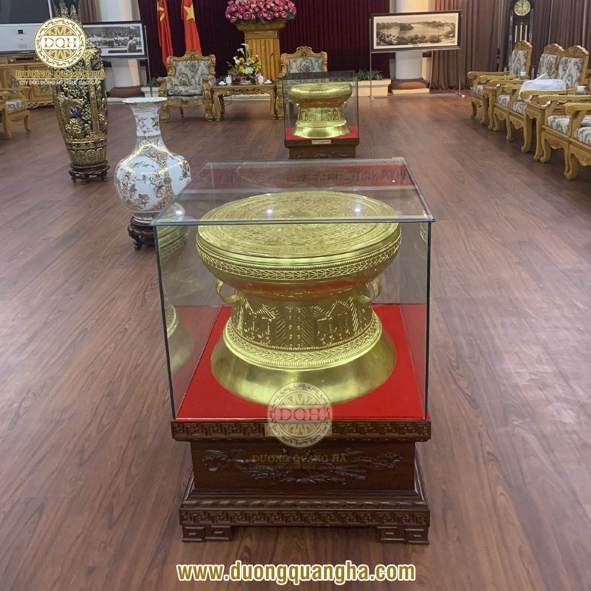 - Quả trống đồng đường kính 60 dát vàng 9999 kèm bệ gỗ gụ
