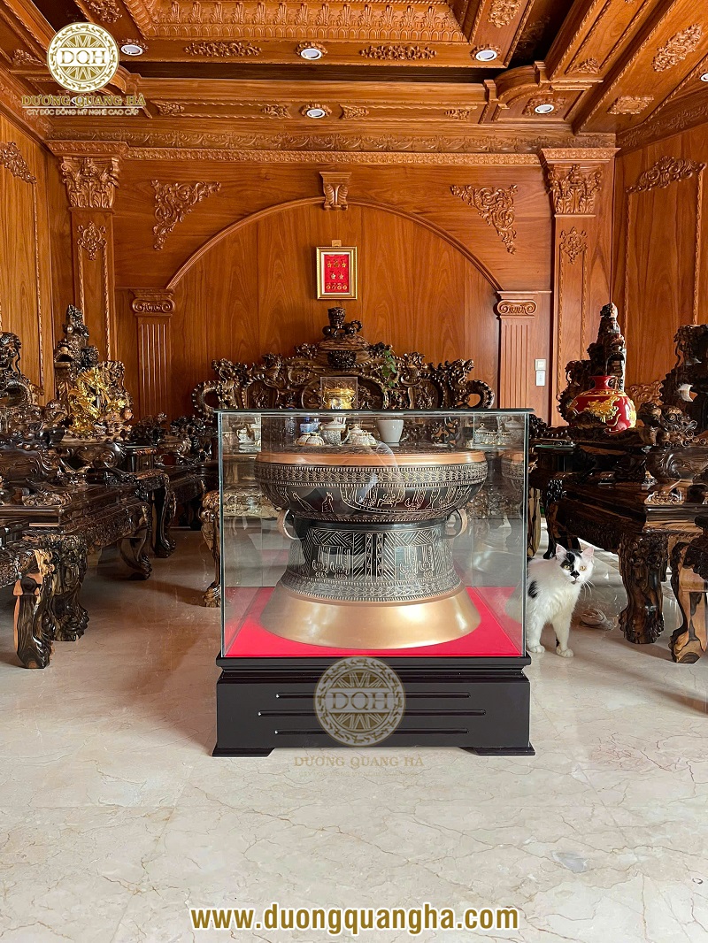 Khi được đặt trong không gian phòng khách sang trọng, trống đồng trở thành điểm nhấn đầy uy nghi, thể hiện đẳng cấp - vị thế - niềm tự hào dân tộc của gia chủ.