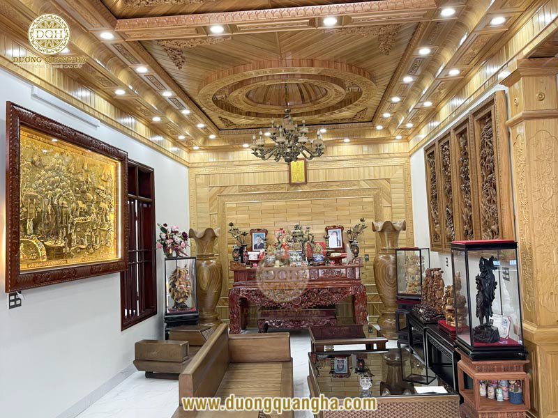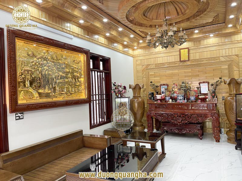Bức tranh có kích thước 2m17 x 1m44 khảm tam khí điểm vàng, được đặt ở vị trang trọng ở không gian phòng khách kết hợp phòng thờ của gia chủ.