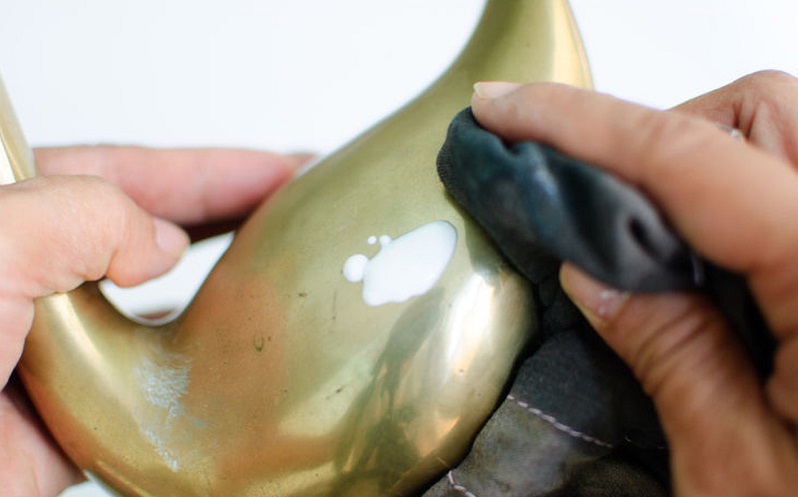 Sử dụng hỗn hợp nước, giấm, kem đánh răng theo tỉ lệ bằng nhau, dùng khăn mềm nhúng vào hỗn hợp và chà lên bề mặt để vết gỉ bong ra. Với đồ đồng bé, bạn có thể ngâm vào dung dịch giấm pha loãng qua đêm, sau đó rửa sạch bằng nước ấm.