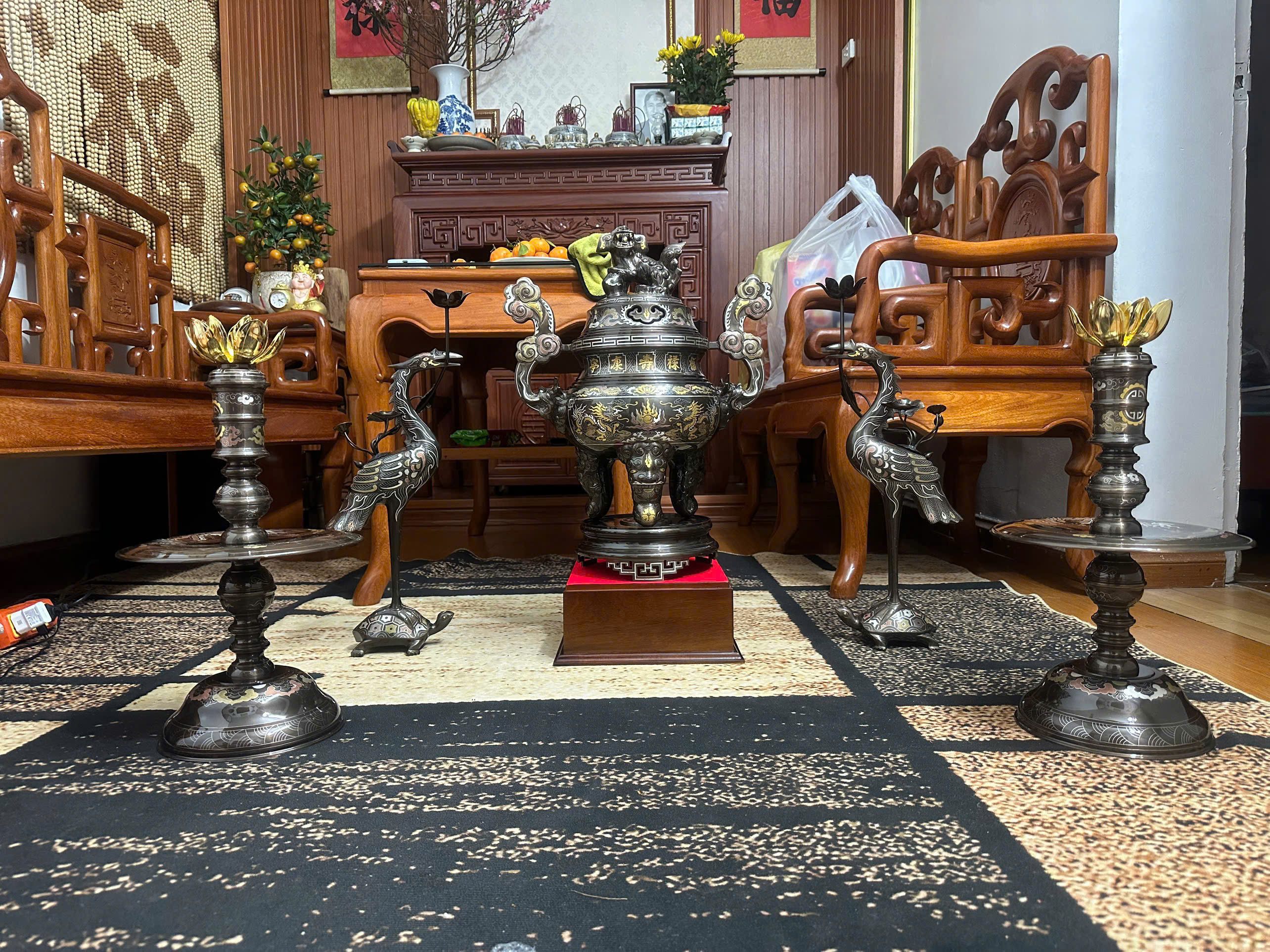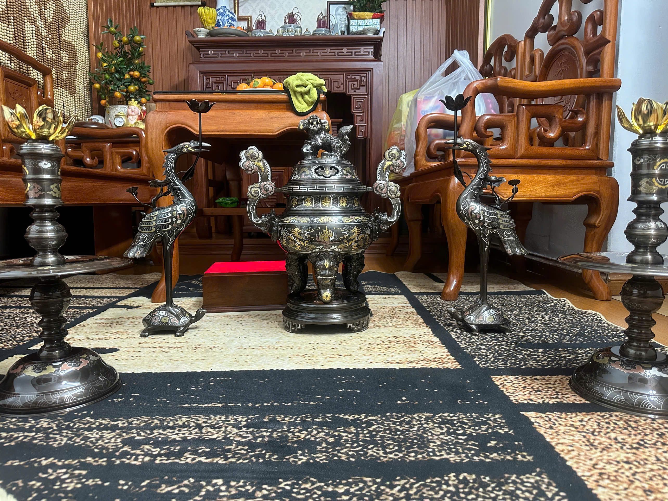 Đồ thờ khảm ngũ sắc là dòng sản phẩm tâm linh cao cấp bậc nhất, đúc thủ công từ đồng đỏ (thường là đồng nồi hè) và chạm khảm tinh xảo 5 loại kim loại quý gồm: Vàng 9999, bạc 9999, đồng đỏ, đồng xanh, và đồng đen. Sản phẩm nổi bật với hoa văn sắc nét, màu sắc sang trọng (vàng, bạc, nâu, đỏ, xanh), độ bền vĩnh cửu và mang ý nghĩa phong thủy tốt.