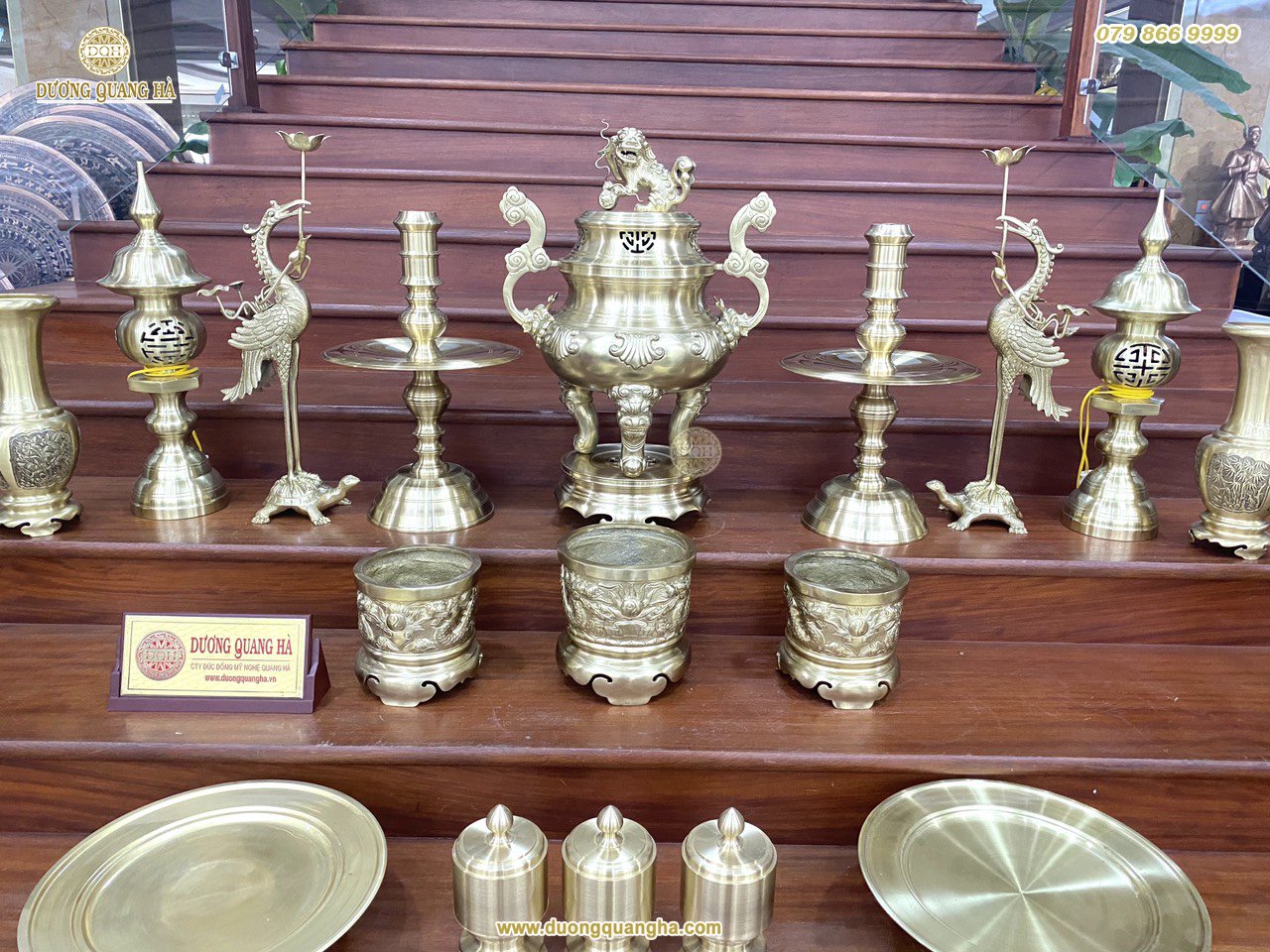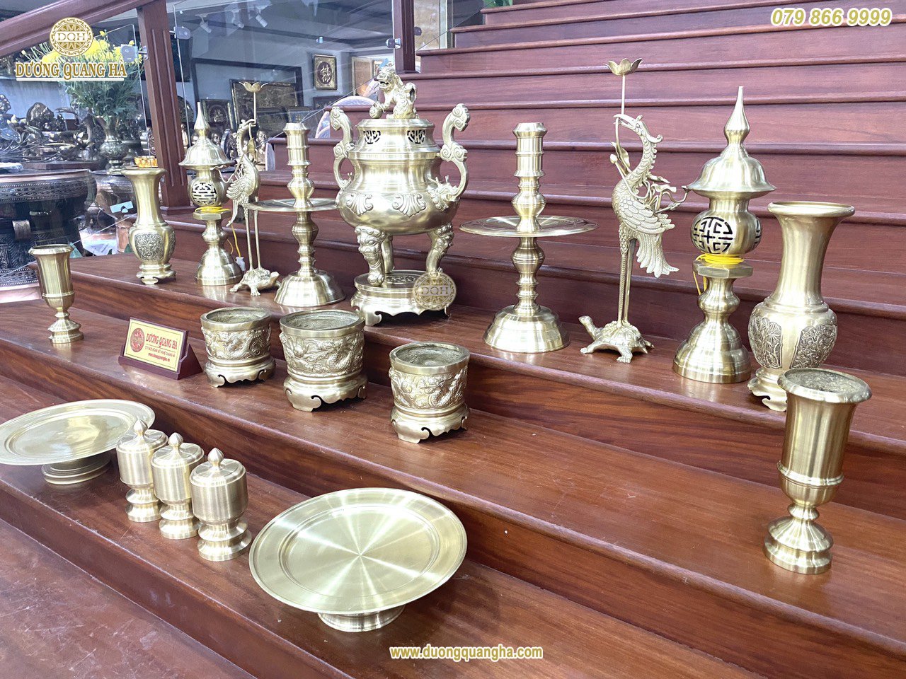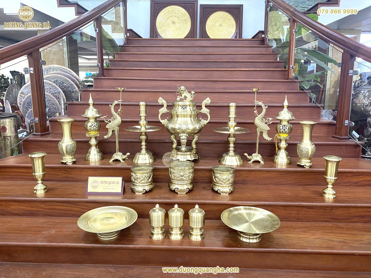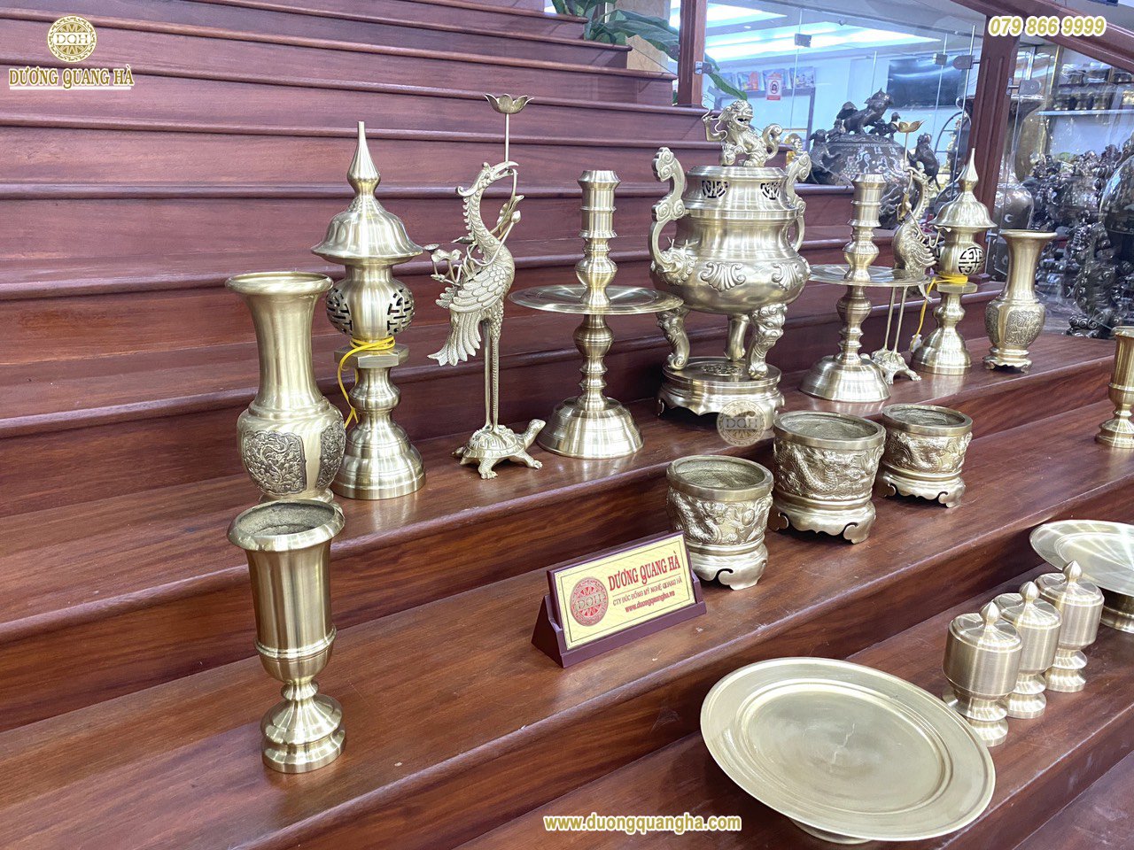 Tên gọi sản phẩm: Bộ đồ thờ đồng vàng cát tút đầy đủ trên ban thờ