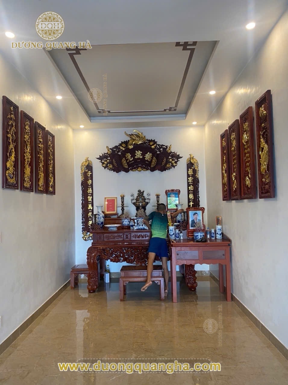 Đồ thảm khảm trong phòng thờ mang ý nghĩa tạo sự trang nghiêm, thể hiện lòng thành kính của gia chủ đối với tổ tiên, gia tăng tính thẩm mỹ và phong thủy cho không gian. Thảm không chỉ giúp giảm đau đầu gối và tạo cảm giác êm ái khi quỳ lạy, mà còn giúp hút âm thanh, giữ cho không gian yên tĩnh và linh thiêng