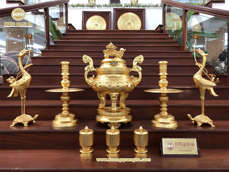 Cùng ngắm nhìn những bộ đồ thờ ngũ sự đồng vàng đẹp tinh xảo do các nghệ nhân đúc đồng truyền thống của Dương Quang Hà thực hiện dưới đây.