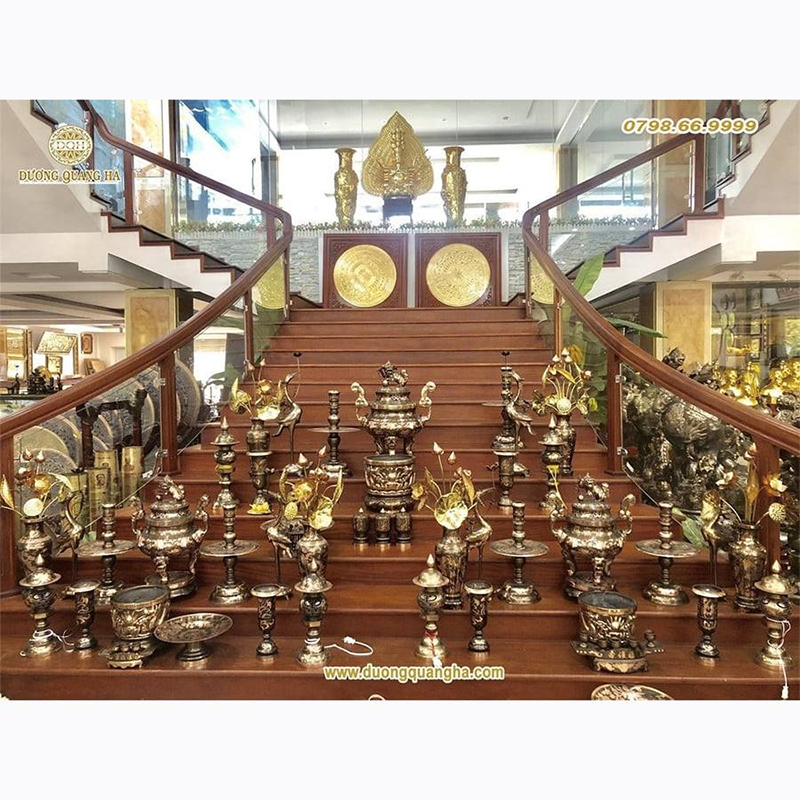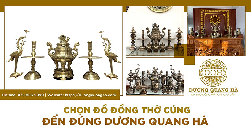 Đến với showroom đúc đồng Dương Quang Hà, quý khách hàng sẽ được lựa chọn các bộ đồ thờ cúng bằng đồng đầy đủ bao gồm: đỉnh thờ đồng, hạc thờ bằng đồng, chân nến, đèn thờ, lọ hoa, mâm đồng, ống hương, bát hương, khay chén, đài thờ, sen thờ, bình rượu, chuông, chiêng, khánh thờ, ngai thờ hoặc được treo thêm các bộ cuốn thư, đại tự, hoành phi câu đối, cửa võng...