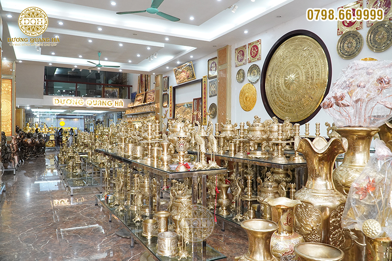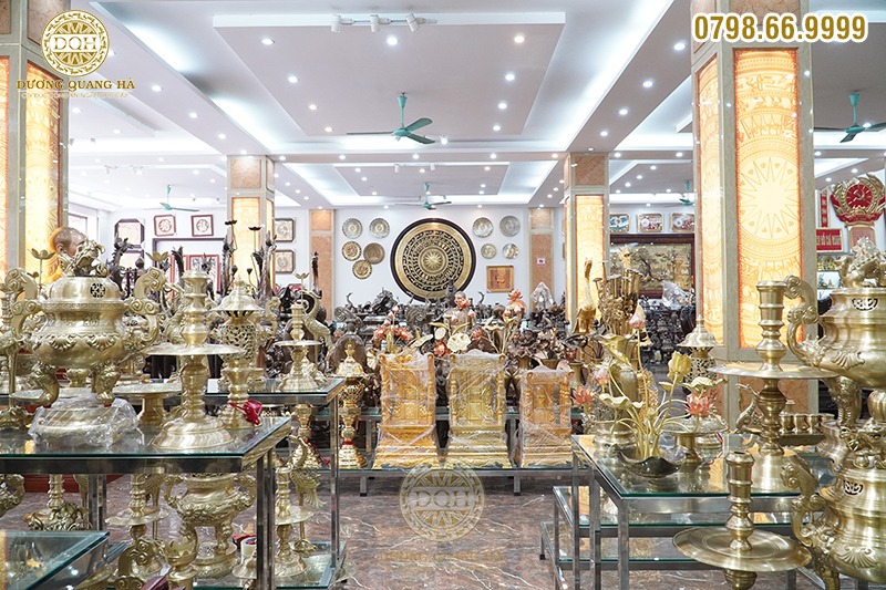 Đến với showroom đúc đồng Dương Quang Hà, quý khách hàng sẽ được lựa chọn các bộ đồ thờ cúng bằng đồng đầy đủ bao gồm: đỉnh thờ đồng, hạc thờ bằng đồng, chân nến, đèn thờ, lọ hoa, mâm đồng, ống hương, bát hương, khay chén, đài thờ, sen thờ, bình rượu, chuông, chiêng, khánh thờ, ngai thờ hoặc được treo thêm các bộ cuốn thư, đại tự, hoành phi câu đối, cửa võng...