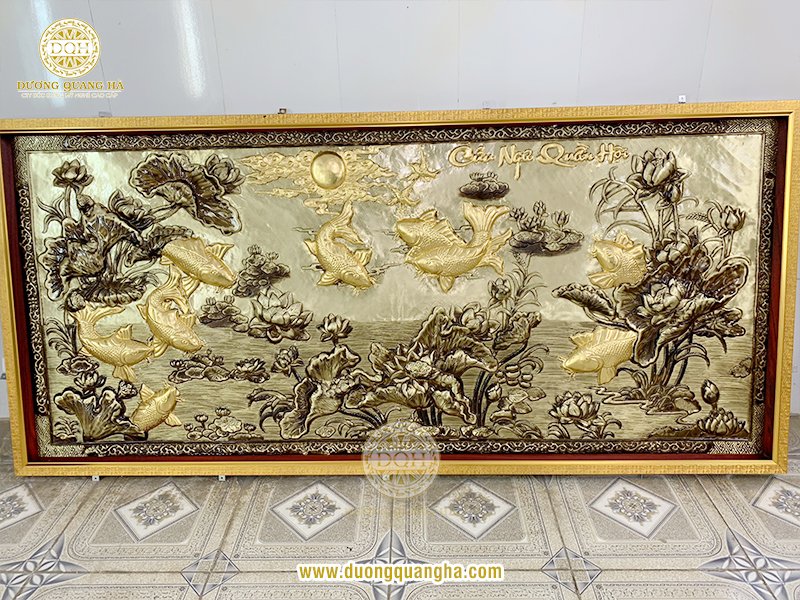 Tranh đồng Cửu ngư quần hội là hình ảnh 9 chú cá chép hội tụ, với những bông hoa thanh cao, không vương mùi bùn, tạo nên một tác phẩm mang đầy ý nghĩa và may mắn. Trong phong thủy, số 9 được xem là số đẹp nhất, mang theo nhiều ý nghĩa tích cực. Hơn nữa, cá chép là linh vật phong thủy liên kết với thành công và danh tiếng. Với tên gọi "cửu ngư dư liên" (chín cá chép và hoa sen) gần giống với "dư giả dài lâu", bức tranh chứa đựng lời chúc gia chủ luôn dư giả, thành công dài lâu trong quá trình kinh doanh.