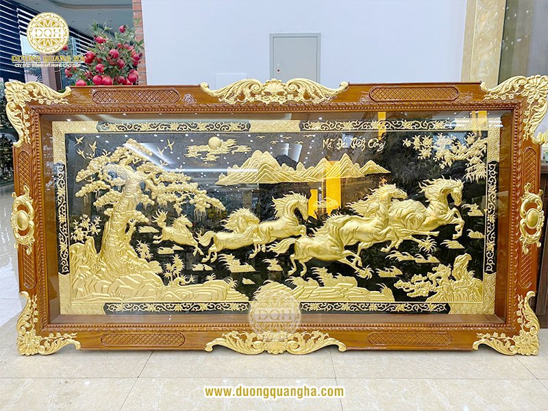 Bức tranh đồng Mã đáo thành công với 8 chú ngựa oai phong, hùng dũng, đang phi nước đại, mang ý nghĩa về sức mạnh và kiên cường. Trong tâm linh dân gian, ngựa thường được coi là biểu tượng của sức mạnh, kiên nhẫn và bền bỉ. Hình ảnh những chú ngựa phi là biểu tượng của tài lộc và vượng khí, mang lại thành công và phát đạt trong kinh doanh.