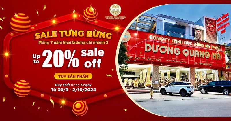 Chào mừng kỷ niệm 7 năm khai trương Chi nhánh 3 của Đúc đồng Dương Quang Hà tại TT Lâm, Ý Yên, Nam Định, Chúng tôi hân hạnh mang đến chương trình khuyến mãi đặc biệt dành cho tất cả khách hàng từ ngày 30/9 đến hết ngày 2/10/2024.