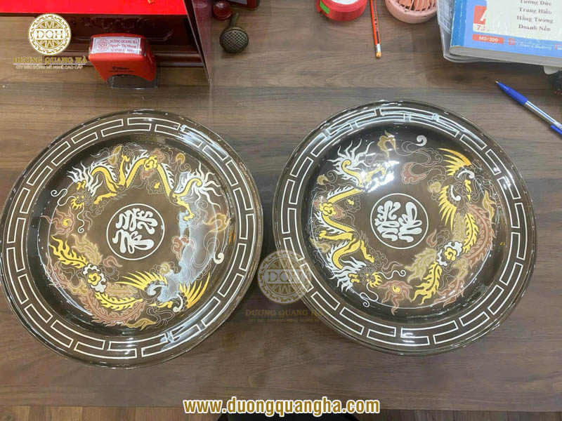 Mâm bồng khảm ngũ sắc họa tiết rồng bao quanh chữ Phúc