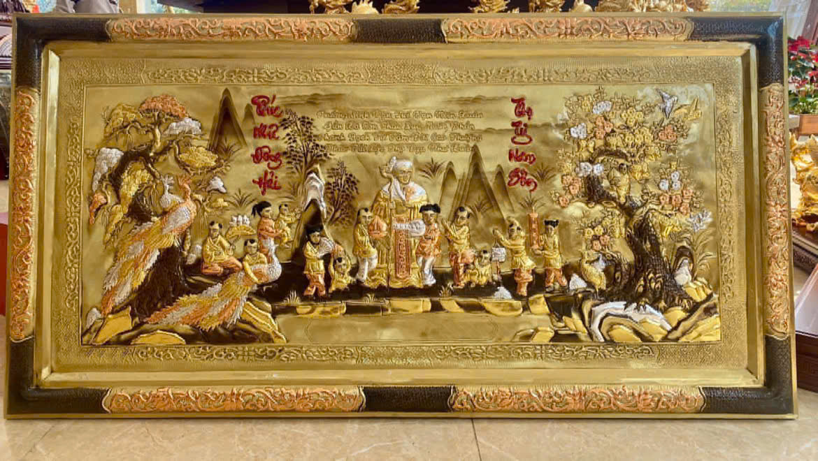 Các mẫu tranh mừng thọ đẹp tại đây được chế tác từ chất liệu đồng cao cấp, đảm bảo độ bền vượt thời gian và vẻ đẹp sáng bóng tự nhiên. Không chỉ vậy, tranh còn được chạm khắc tỉ mỉ, tinh tế với nhiều họa tiết mang ý nghĩa tốt lành như rồng, phụng, chữ "Thọ", cảnh ông bà quây quần bên con cháu hay hình ảnh thiên nhiên thanh bình. Mỗi tác phẩm không chỉ là một món quà mừng thọ ý nghĩa mà còn là một tác phẩm nghệ thuật độc đáo, góp phần làm nổi bật không gian trưng bày.