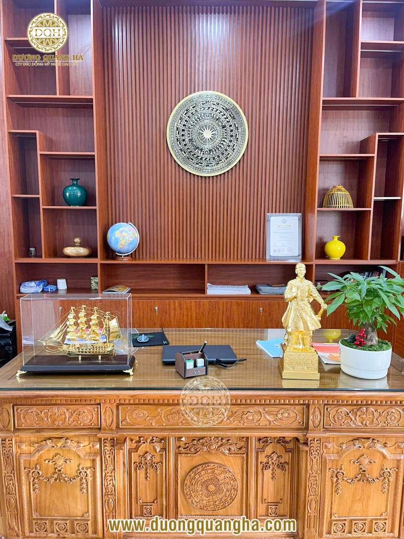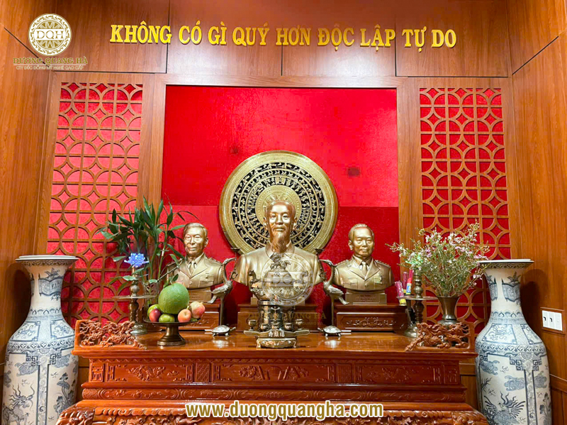 Những không gian lớn nên đặt tranh kích thước phù hợp, bố cục rõ ràng như: tranh Thuận buồm xuôi gió, tranh Bác Hồ, tượng danh nhân, tranh mặt trống đồng, tranh phù điêu, giúp tăng tính trang trọng và nhận diện thương hiệu.