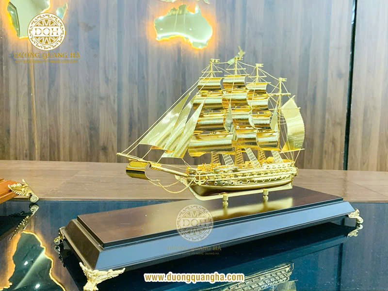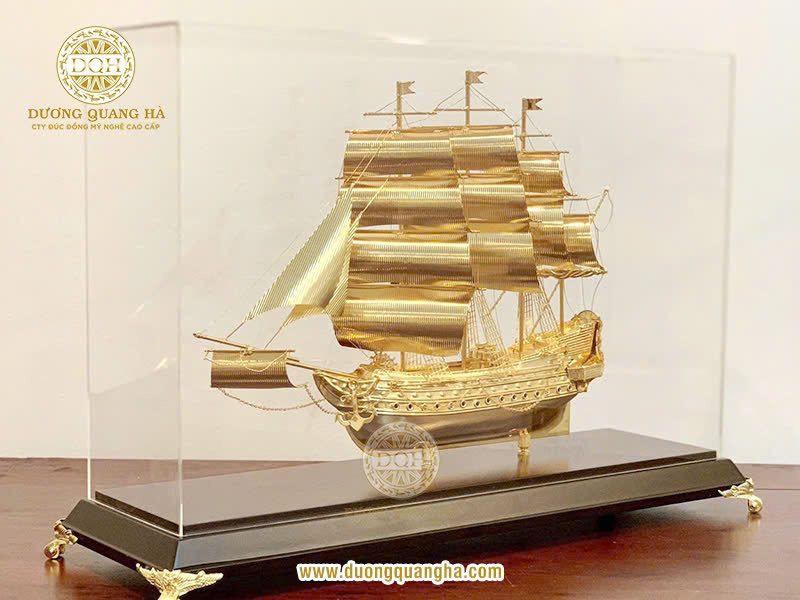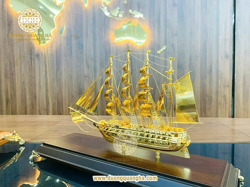 Một chiếc thuyền buồm mạ vàng thường được chế tác thủ công tinh xảo với từng chi tiết được chăm chút tỉ mỉ, từ thân thuyền, cánh buồm cho đến các phụ kiện trang trí. Sự kết hợp giữa nghệ thuật chế tác và lớp mạ vàng cao cấp đã tạo nên một tác phẩm nghệ thuật tuyệt đẹp, xứng đáng để trưng bày trong không gian sống hoặc làm việc.