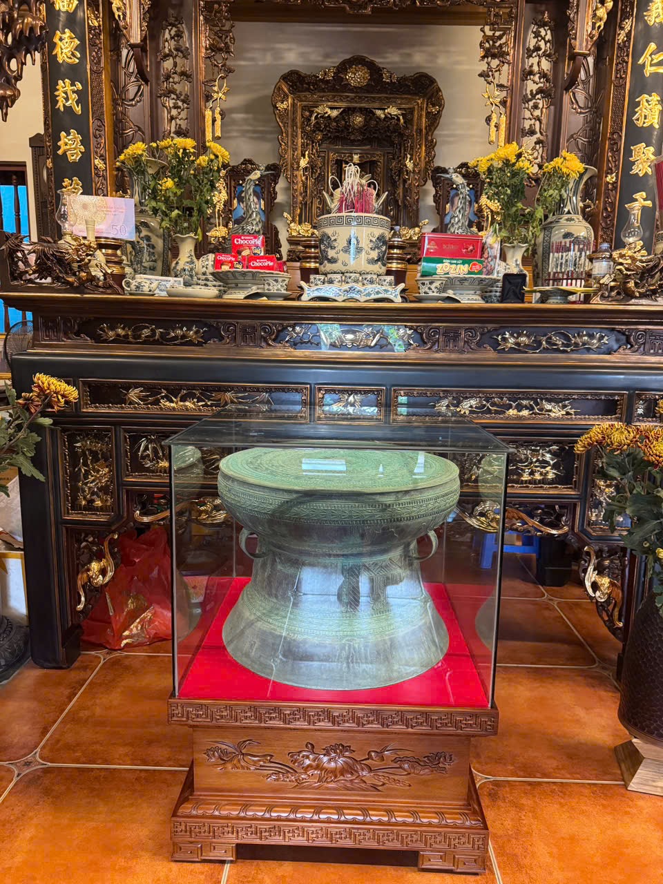 Trống đồng cổ có màu xanh rỉ (xanh rêu, xanh ngọc bích) là hiện tượng tự nhiên do quá trình oxy hóa đồng lâu năm, điển hình là các trống Đông Sơn như trống Ngọc Lũ, tạo nên vẻ đẹp cổ kính, độc đáo; màu xanh này là lớp gỉ đồng (patina), chứng tỏ tính xác thực của cổ vật, và thường được bảo tồn thay vì làm mất đi để giữ nguyên giá trị lịch sử, thẩm mỹ.