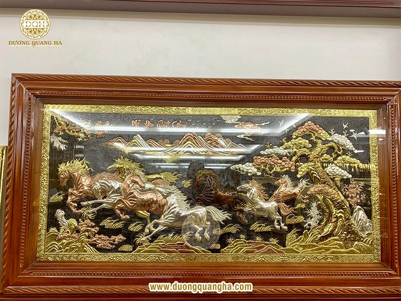Tranh đồng ngựa phi trên đồng cỏ bao gồm 8 con ngựa đang phi trên nước đại trên đồng cỏ tươi tốt. Bức tranh đồng này hay được treo ở phòng khách vì ý nghĩa mong cầu tài lộc danh vọng.