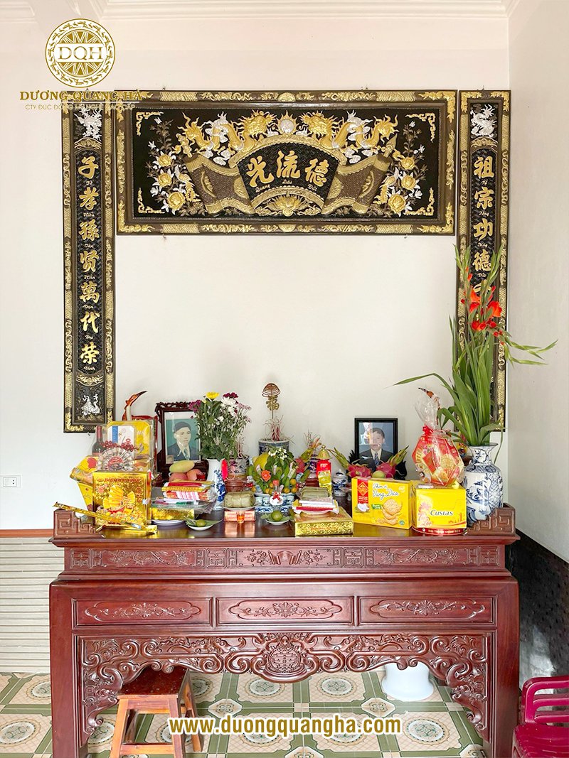 - Bàn thờ có kích thước trên 2m17: Chọn đại tự câu đối 1m97 trở lên