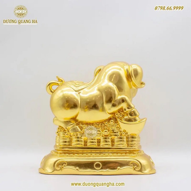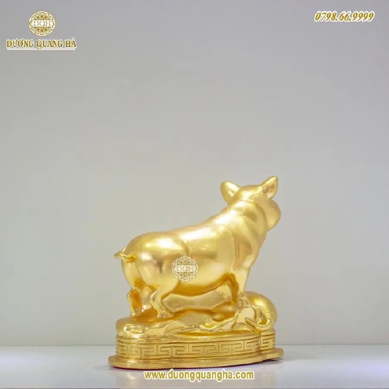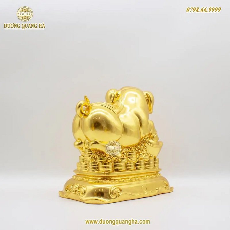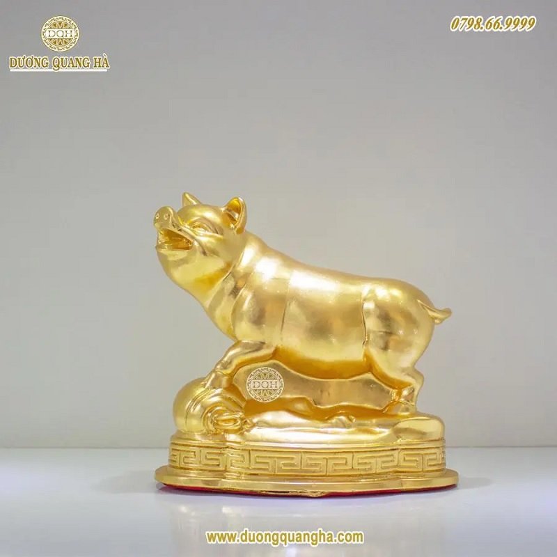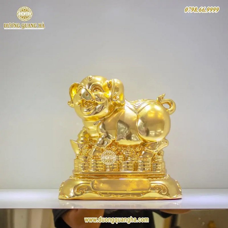 Heo được làm bằng đồng và mạ vàng ngoài bề mặt. Ngoài ra, đồ đồng Dương Quang Hà còn nhận mạ vàng 24k, thiếp vàng 9999 lên bề mặt của sản phẩm với độ tỉ mỉ và yêu cầu khắt khe nhất về chất lượng như các linh vật: Hổ mạ vàng, Dê mạ vàng 9999,... hay Mặt trống đồng mạ vàng...