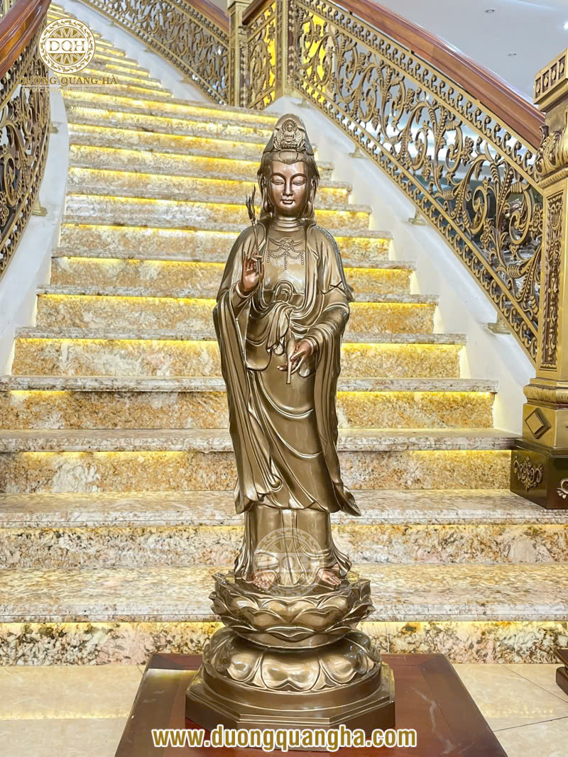 - Quan Âm dáng đứng: Hình ảnh Quan Âm đứng biểu trưng cho sự giác ngộ và lòng từ bi thanh cao. Đây là dáng tượng phổ biến, thể hiện sự vững chãi, bảo hộ và che chở chúng sinh, thường được đặt tại các đền chùa hoặc không gian thờ cúng trong gia đình.