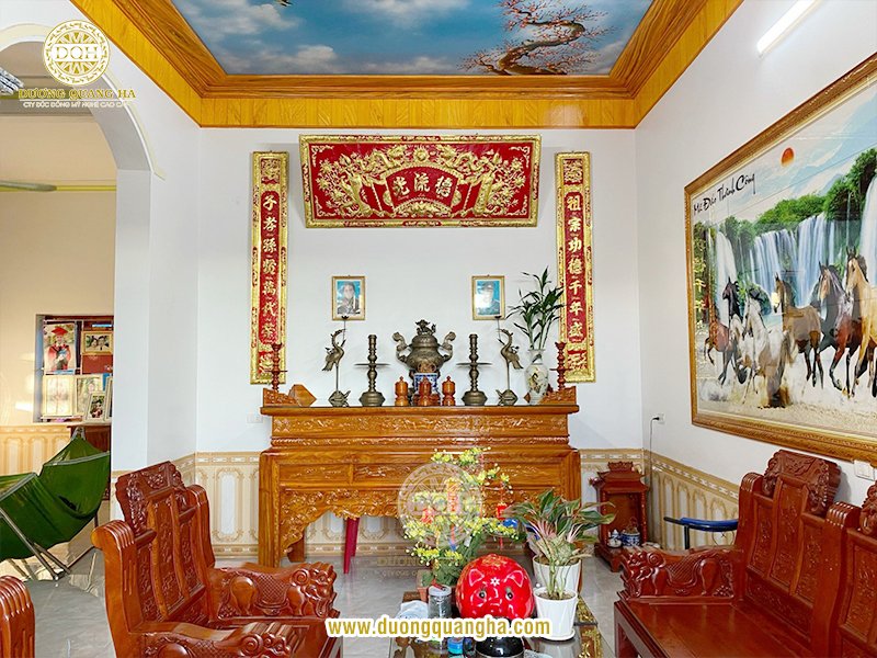 - Vị trí treo hoành phi phải ở trung tâm và cao nhất trên bàn thờ, hai câu đối được treo hai bên, thấp hơn hoành phi để giữ sự cân đối và trang nghiêm cho không gian thờ cúng.